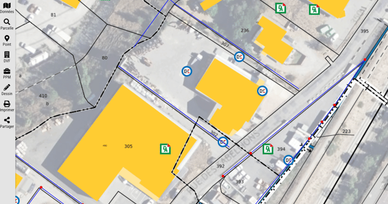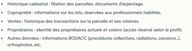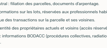 Propriétaires : identité des propriétaires actuels et voisins (accès réservé selon le profil).
